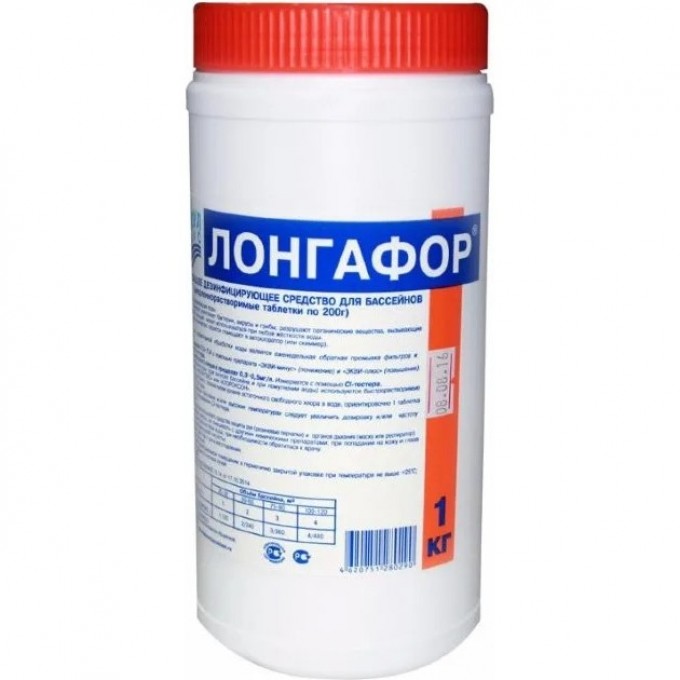 Лонгафор в таблетках по 200 гр. для плавающих дозаторов, предназначен для обеззараживания воды и уничтожения вирусов и бактерий. Препарат эффективно разрушает органические вещества, вызывающие мутность воды, а также надежно противодействует росту микроспор зелёного планктона в открытых бассейнах. Отлично подходит для осветления воды в бассейне. Благодаря специальному химическому составу, а также уникальной методики изготовления, таблетки Лонгафора медленно растворяются в воде, постепенно и с равной концентрацией. Полное растворение таблетки в бассейне от семи до четырнадцати дней в зависимости от температуры и жесткости воды.